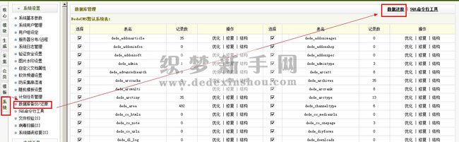 4、进入dedecms后台,点击左侧“系统”菜单中的“数据库备份/还原”子菜单,在右侧出现的界面中,点击右上角的“数据还原”。