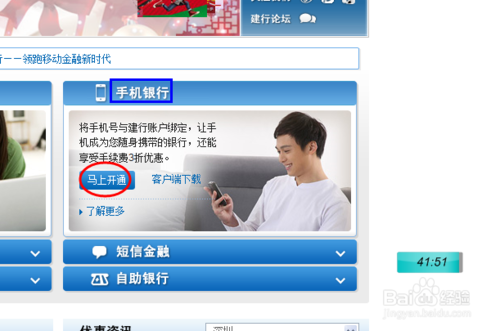 在页面的右下角会有手机银行,如下图,选择“马上开通”。