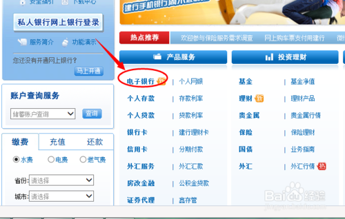 成功进入中国建设银行的官网后,如下图,选择产品与服务下面的电子银行,点击进入。